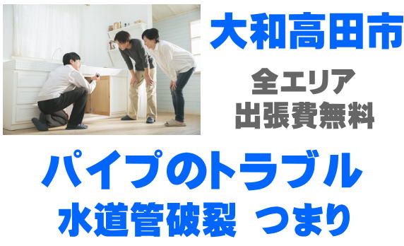 大和高田市でパイプの修理を行っています。水漏れ、つまり、水道管破裂、凍結、漏水などのお困りごとはご相談ください。